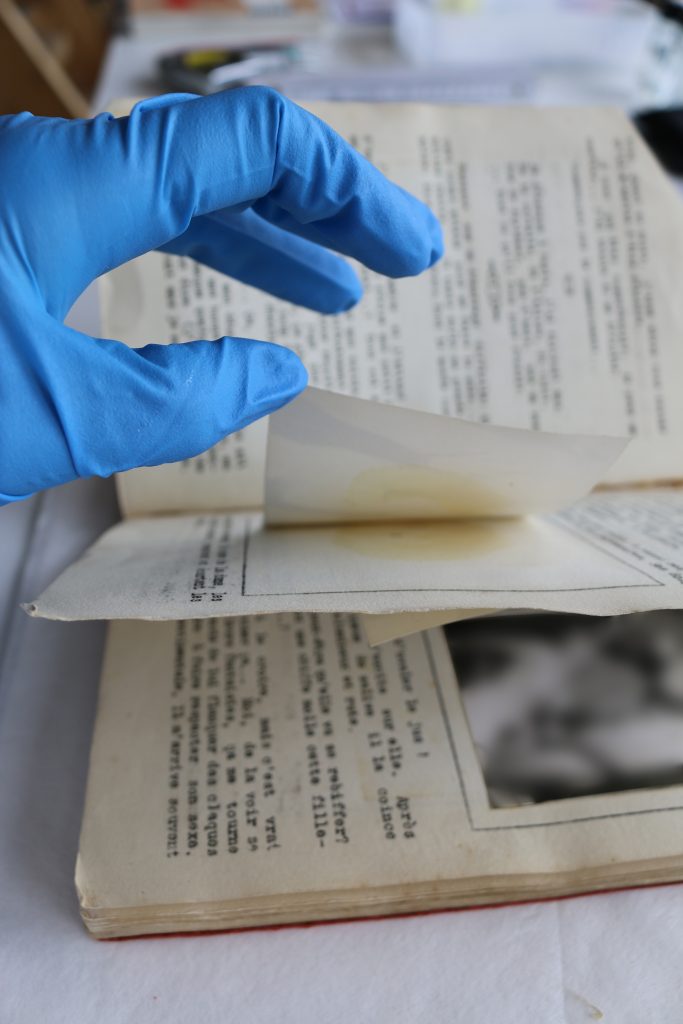 Jeder Restaurierung geht eine Trockenreinigung voran, damit Verschmutzungen nicht weiter in das Papier eindringen oder zum Beispiel Wasserränder entstehen.